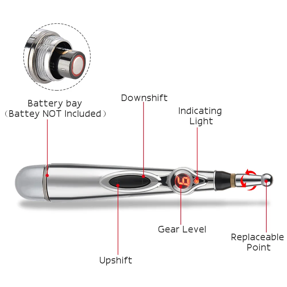 Характеристики: Абсолютно новый и высокое качество Тип: акупунктурная ручка Материал: АБС-пластик Размер: 23x8.5x3.2 см/9,06x3,35x1,26 дюйма (прибл.) Батарея: 1 батарея AA (входит в комплект) Тип красоты лица: поверхностная терапия, которая применима для здравоохранения и украшения лица. Тип узла: узловая терапия, которая применима для частичных болей в организме. Сфероидальная: частичная терапия, которая применима для быстрого облегчения боли. Тип иглоукалывания: подходит для широкого спектра массажа боли, подходит для нарезания и массажа катания для облегчения боли. Тип обрезания: aplicable для иглоукалывания и кровообращения.
