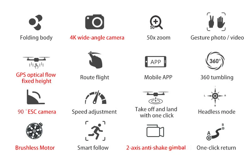 Функция глобальной системы позиционирования: Глобальная система позиционирования отслеживает более 30 м, изображения треков 5-30 м, отслеживание полета, кругосветное и спутниковое позиционирование двойного режима Объектив: 118 градусов, самостабилизирующий электронный анти-Вибрационный объектив Расстояние возврата изображения (без помех, без окклюзии): 1200 метров Разрешение видео (фронтальная камера): 4K(2160*3840 пикселей) Разрешение камеры (фронтальная камера): 4K(2160*3840 пикселей) Формат изображения видео формат: jpgm4 или AVI" Фокусное расстояние: 50 раз Требования к версии мобильного устройства: iOS 9,0 или выше/Android 4,4 или выше Бесщеточный двигатель: 1806 Режим приема пульта дистанционного управления: 2,4G Барометр: GPS/оптический поток Режим беспроводного приема: 5G Поворотная Камера: 90 градусов Емкость интеллектуального литиевого аккумулятора: 7,6 в 3000 мАч Дистанция дистанционного управления (без помех, без препятствий): 1200 метров Время полета: около 25-28 минут Время зарядки: около 5 часов Режим зарядки: Универсальный последовательный автобус (5 В/3 а) 1. Возврат к точке снятия с помощью GPS с одним касанием, возврат домой с низкой мощностью и возврат домой без сигнала. 2. Когда самолет подключен к GPS, включите функцию отслеживания приложения, и самолет будет отслеживать мобильный телефон. Отслеживание изображения: 1-5 метров от самолета для определения цели и выполнения автоматического отслеживания полета. 3. Распознавание жестов съемки: в пределах 1-5 метров от самолета, сделайте жесты камеры/жесты камеры к камере. 4. Многоточечное планирование маршрута полета: самолет будет летать автономно в соответствии с заданным маршрутом, и игрок будет концентрироваться на съемке. 5. Окружение с фиксированной точкой: Найдите центральную точку окружения, а затем перемещайте требуемый радиус круга через джойстик. 6. Функция поиска самолета: нажмите значок gps-сигнала три раза подряд, чтобы открыть интерфейс карты. На этой карте показаны последние расстояния, широта и долгота самолета. 7. Функция MV: фильтрация, специальные эффекты видео, добавление фоновой музыки, обмен фотографиями/видео Защита безопасности: Защита от низкого заряда батареи (автоматическое возвращение в домашнее положение), защита от бега (автоматическое возвращение в домашнее положение в чехол потери сигнала)