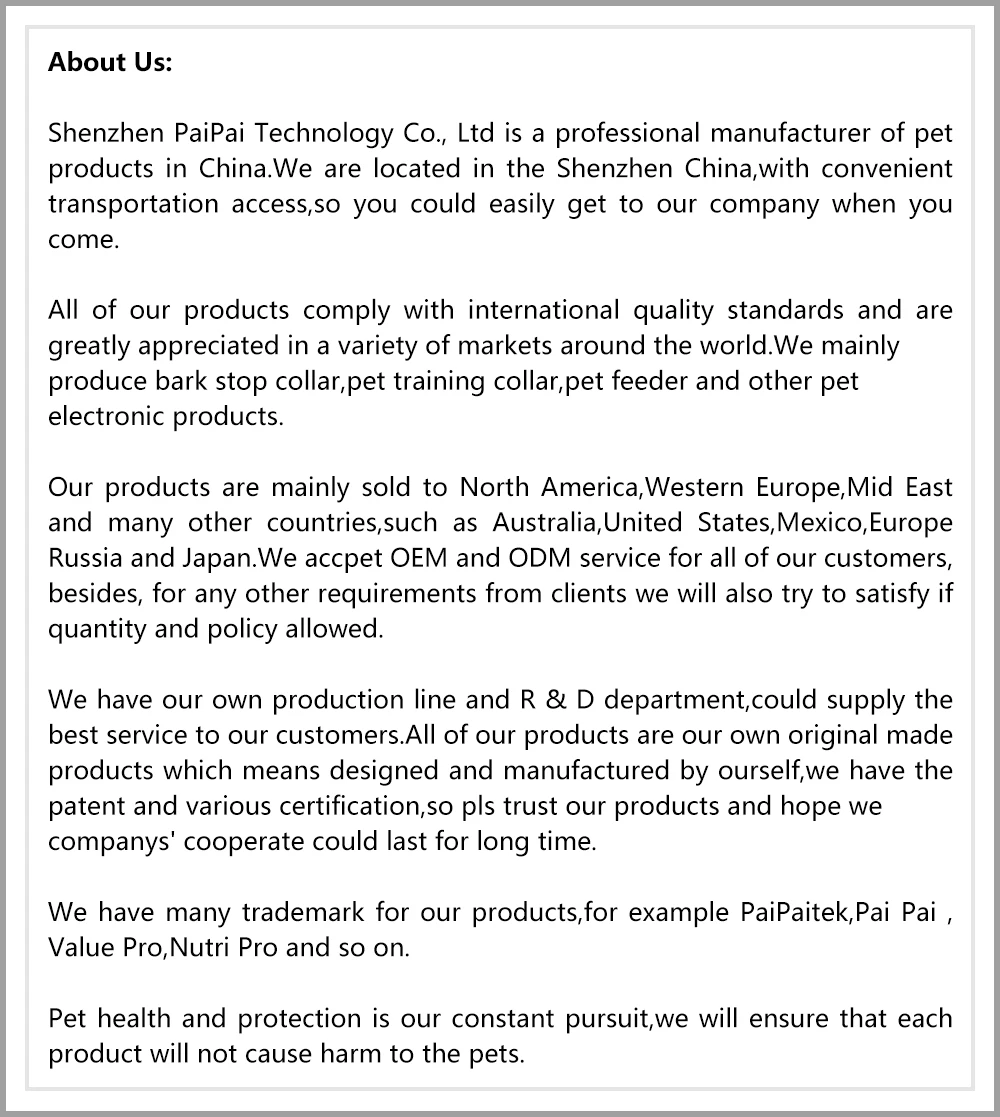 Номер модели: PD218V-1 Цвет: черный Функция: Автоматическая Описание: ошейник для собаки без ударов Тип батареи: перезаряжаемый Срок службы батареи: 400 циклов зарядки Время зарядки: 2 часа Время работы: 45 дней + Безопасный и гуманный ошейник для собак