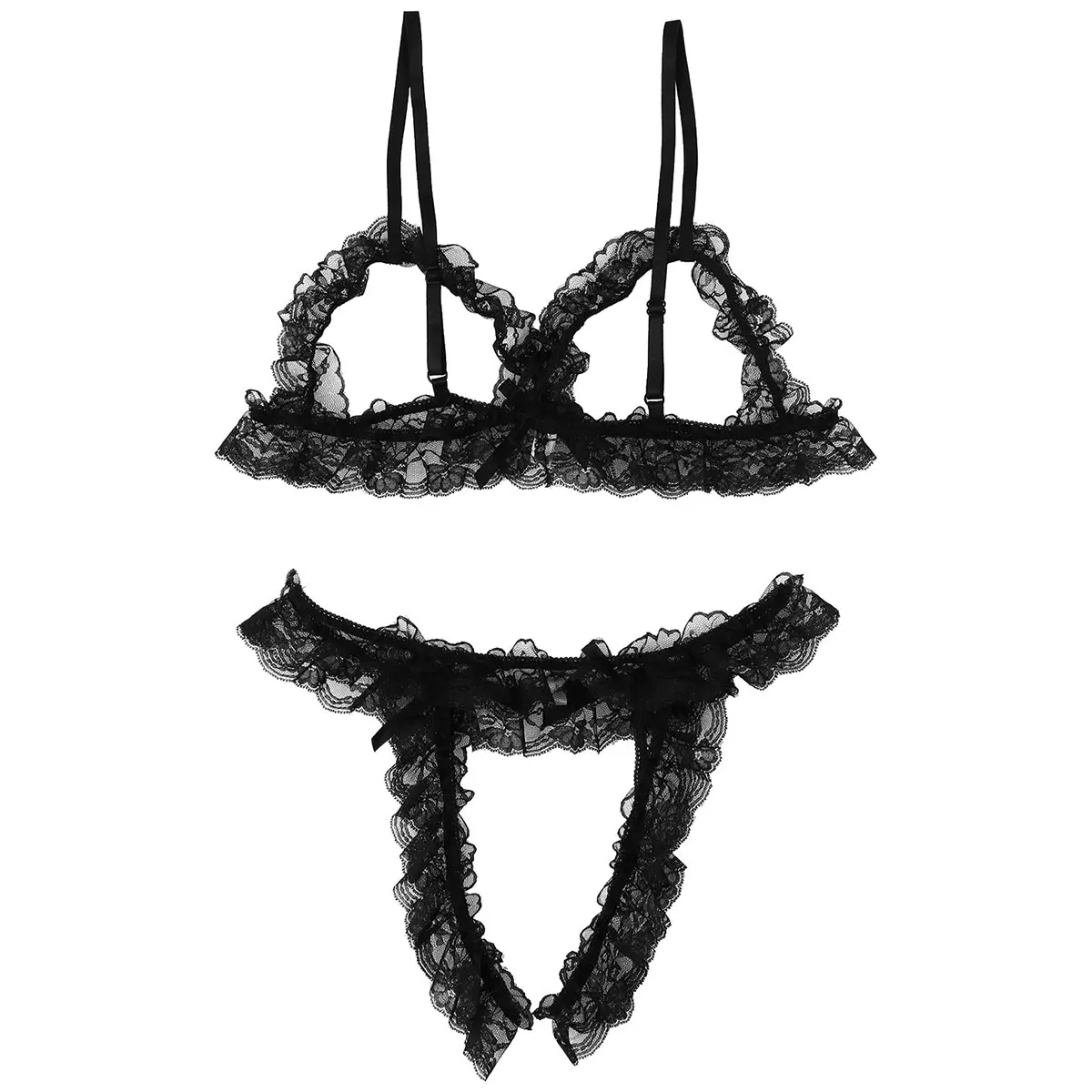 Бюстгальтер имеет регулируемые бретельки, глубокий v-образный вырез и открытые чашечки, эластичное нижнее белье для удобной посадки.