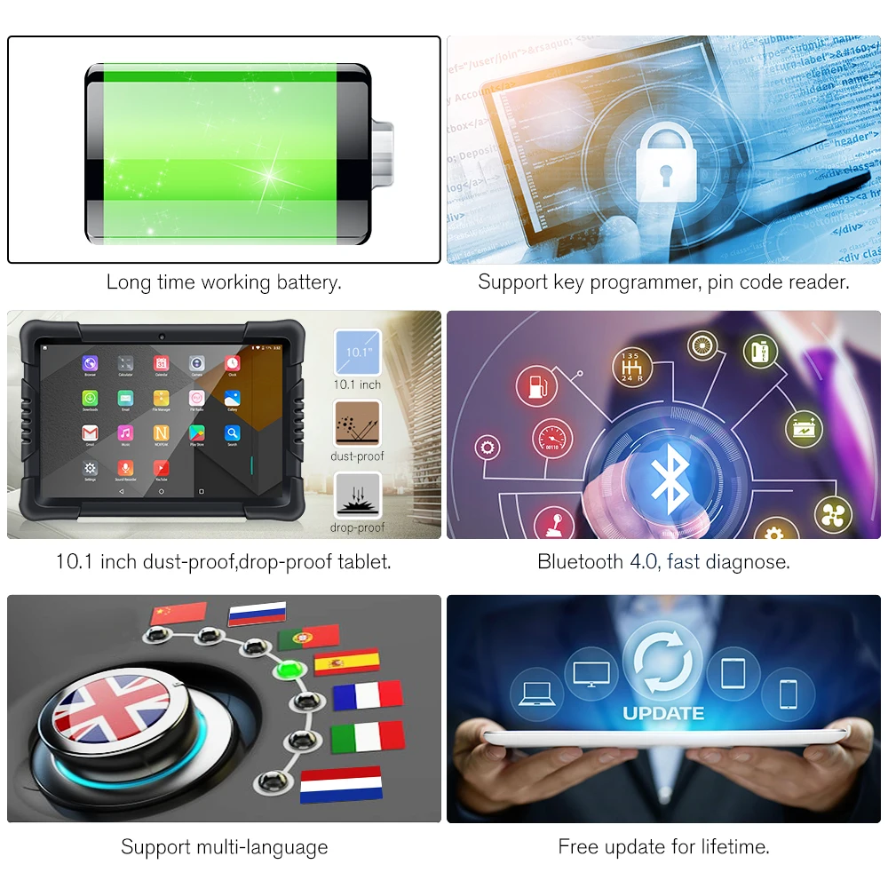 1. Полная диагностика систем. 2,9 специальные функции, включая ключевой программист, считывание ПИН-кода. 3.10.1 дюймовый пыленепроницаемый drop-proof Android планшет. 4. Долгое время работы батареи. 5.Bluetooth 4,2, Быстрая диагностика. 6. Поддержка нескольких языков. 7. Бесплатное обновление для срока службы.