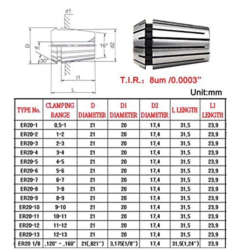 Диаметр зажима пружины: 1/2/3/4/5/6/7/8/9/10/11/12/13 мм + 1/8 дюйма, 14 шт ER20 цанговый набор. Высококачественные пружинные стальные материалы, долговечные и долговечные.