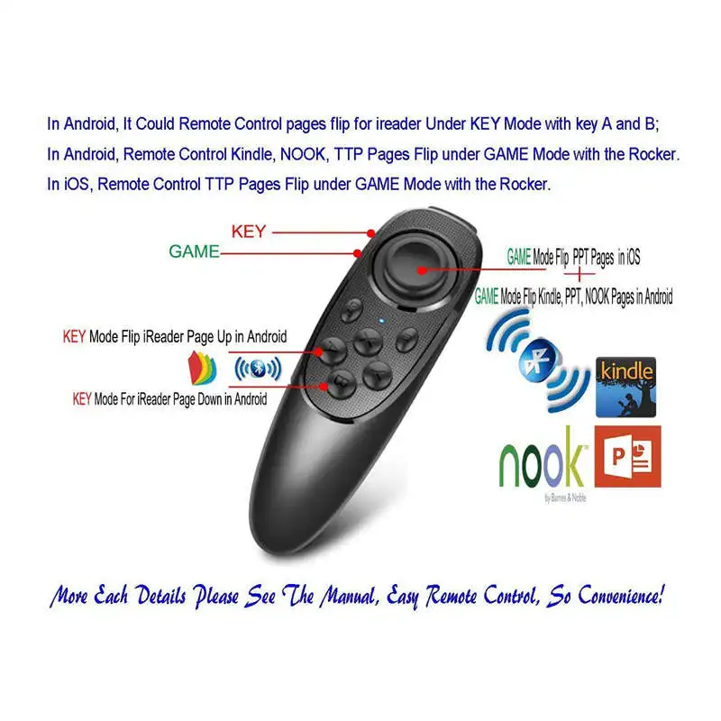 3. Для телефонов с системой Android этот контроллер может работать с пультом дистанционного управления: 1). Регулировка и уменьшение объема; 2). Воспроизведение видео или музыки; 3). В качестве затвора для селфи или фотосъемки; 4). Электронная книга flip in iReader, такие как kindle, nook, ppt; 5). Управление мышью; 6). Полностью функции дистанционного управления будут доступны в играх виртуальной реальности.
