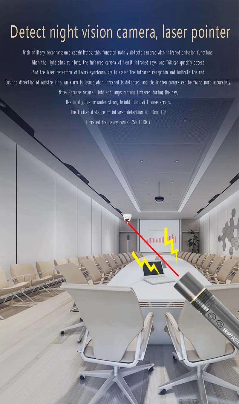 Объем: 23,6x130 мм Вес: 56 г Интерфейс зарядки: Type-c Время работы: 33 часа подряд (Дифференцированный по функциям) Коэффициент усиления антенны:-56 дБ Зарядное устройство: 5 В/1 а постоянного тока Батарея: 3,7 V /5oomA литий-полимерный аккумулятор Чувствительность: 3 уровня регулировки Singal Дальность обнаружения: 1 МГц-6,5 ГГц Расстояние обнаружения сигнала: GSM :50-300 см 3Г и 4 г: 20-100 см WIFI : 10-100 см Оптические линзы: Специальное оптическое стекло Расстояние обнаружения лазера: 1-10 м Инфракрасный Частотный диапазон: 750-1100nm Инфракрасное Расстояние обнаружения: 1-10 метров (в зависимости от интенсивности источника светильник, видимый светильник И сильный интерфейс освещения в течение дня) Материал: Поликарбонат