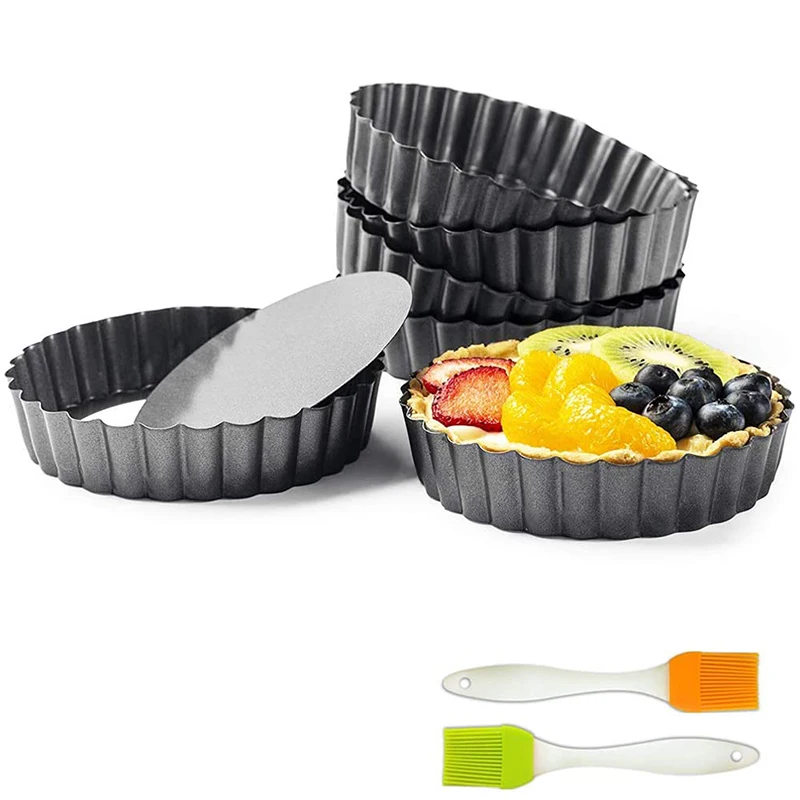 Яйцо Пирог сковорода 4 дюйма, живое дно мини Quiche пиццы торт Пан, антипригарные круглые щелевые Flan 6 шт и Силиконовые кисти