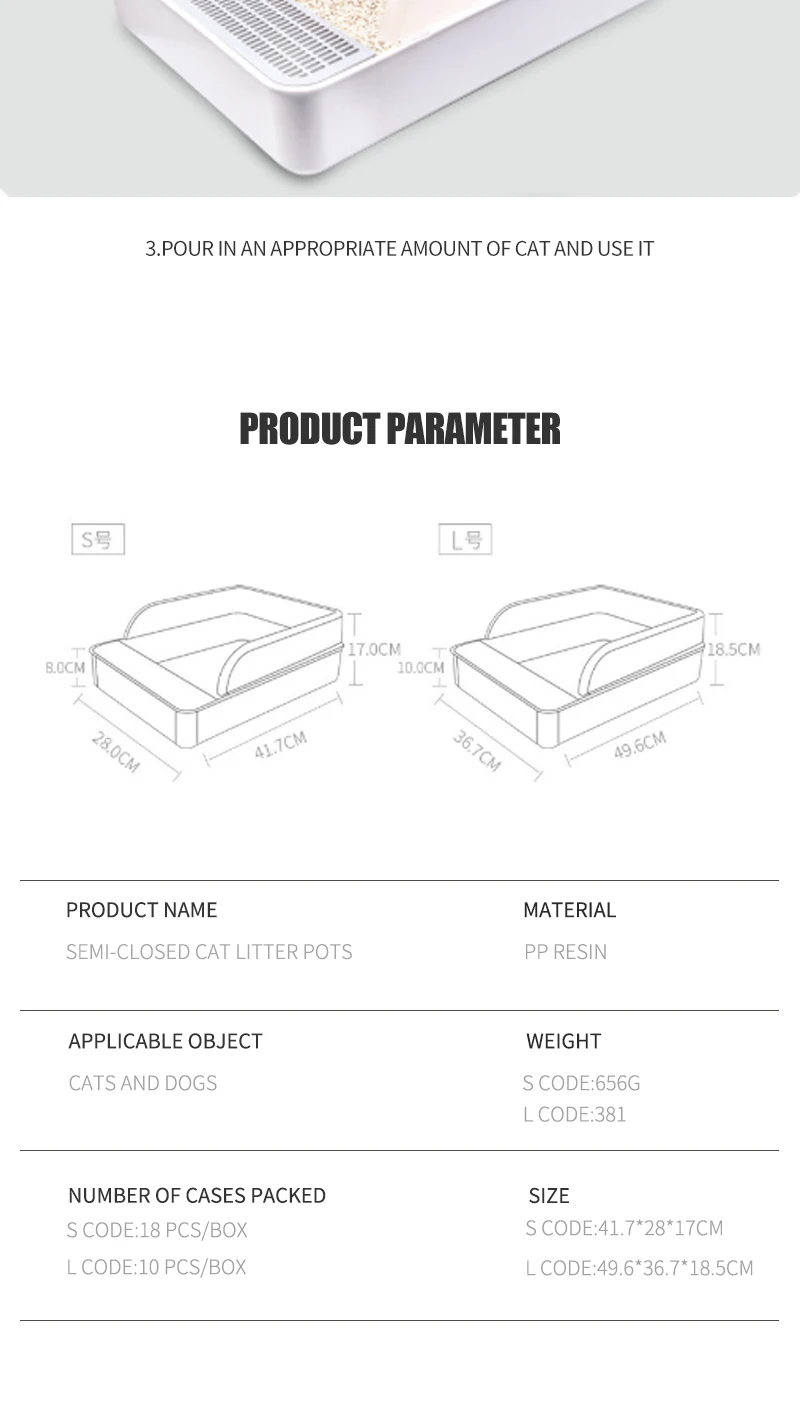 Характеристики: Цвет: белый/серый Материал: АБС-пластик Характеристики: полузакрытый Размер: около 40*26*14 см/15,75*10,24 * 5.51in Вес: S: около 900 г (в комплект входит) L: около 1,3 кг (в комплекте) Функции: 1. Интегрированная педаль падающего песка; 2. Съемная изоляционная панель Посылка: 1 * кошачий Туалет 1 * Лопата для кошачьих туалетов Только вышеуказанная посылка, другие товары не включены. Примечание: 1. Светильник и различные дисплеи могут привести к тому, что цвет товара на картинке немного отличается от реального. 2. Допускается погрешность в измерениях +/- 1-3 см.