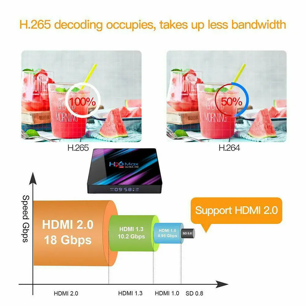 1. Последняя ОС Android 9,0. Он повышает производительность и удобство использования, Совместимость с новейшими приложениями android и приложениями работают плавно без каких-либо задержек или замораживания. 2. Мощный чип. H96 MAX Android TV BOX питается от новейшего четырехъядерного процессора RK3318 64bit Cortex-A53, GPU Mali-450, это лучше при обработке изображений. Предоставляет пользователям лучший опыт сверхбыстрой скорости работы и профессиональной обработки изображений. 3. 4K Ultra HD. С HDMI 2.0a, поддерживает выход H.265 4K, более мощный, чем H.264, позволяет смотреть фильм 4K гладко, и каждая деталь экрана глянцевая, приносит вам более реальные фильмы, игры и музыкальный опыт. 4. Удобное соединение. 2,4 ГГц/5 ГГц двухдиапазонный Wi-Fi и Bluetooth 4,1, встроенный Wi-Fi мышь и клавиатура через порт USB или bluetooth, вы можете управлять им легче и удобнее. Гораздо больше вариантов подключения, когда вы смотрите видео и играете в игры и т. Д.