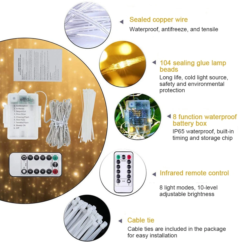 1. Встроенный 8 видов режимов освещения и регулировка яркости, подходит для различных сцен. 2. Каждый светодиодный шарик лампы параллельен, поэтому его можно произвольно разрезать в соответствии с размером зонта, поэтому он подходит для садовых зонтов от 6 футов до 10 футов. 3. Пульт дистанционного управления имеет различные практические функции, такие как переключение эффекта освещения, регулировка яркости, переключатель цикла и т. д., которые могут еще больше оптимизировать ваш пользовательский опыт. 4. Водонепроницаемый-мы водонепроницаем батарейный отсек и светильник, а Водонепроницаемость аккумуляторного отсека достигает IP65 Описание: Материал корпуса: ПВХ Размер: 8*1300 (мм) Характеристики лампы: 104 Регулировка яркости: Да Срок службы: 50000H (H) Уровень защиты: IP65 Тип: светодиодный светильник-зонт Входное напряжение: 5 В (в) Световой поток: 520 (лм) Батарея: 3 * батарейки AA (не входят в комплект) Светильник; Цвет: теплый белый, чистый белый Область применения: Рождественский день свадьбы Бар Ресторан