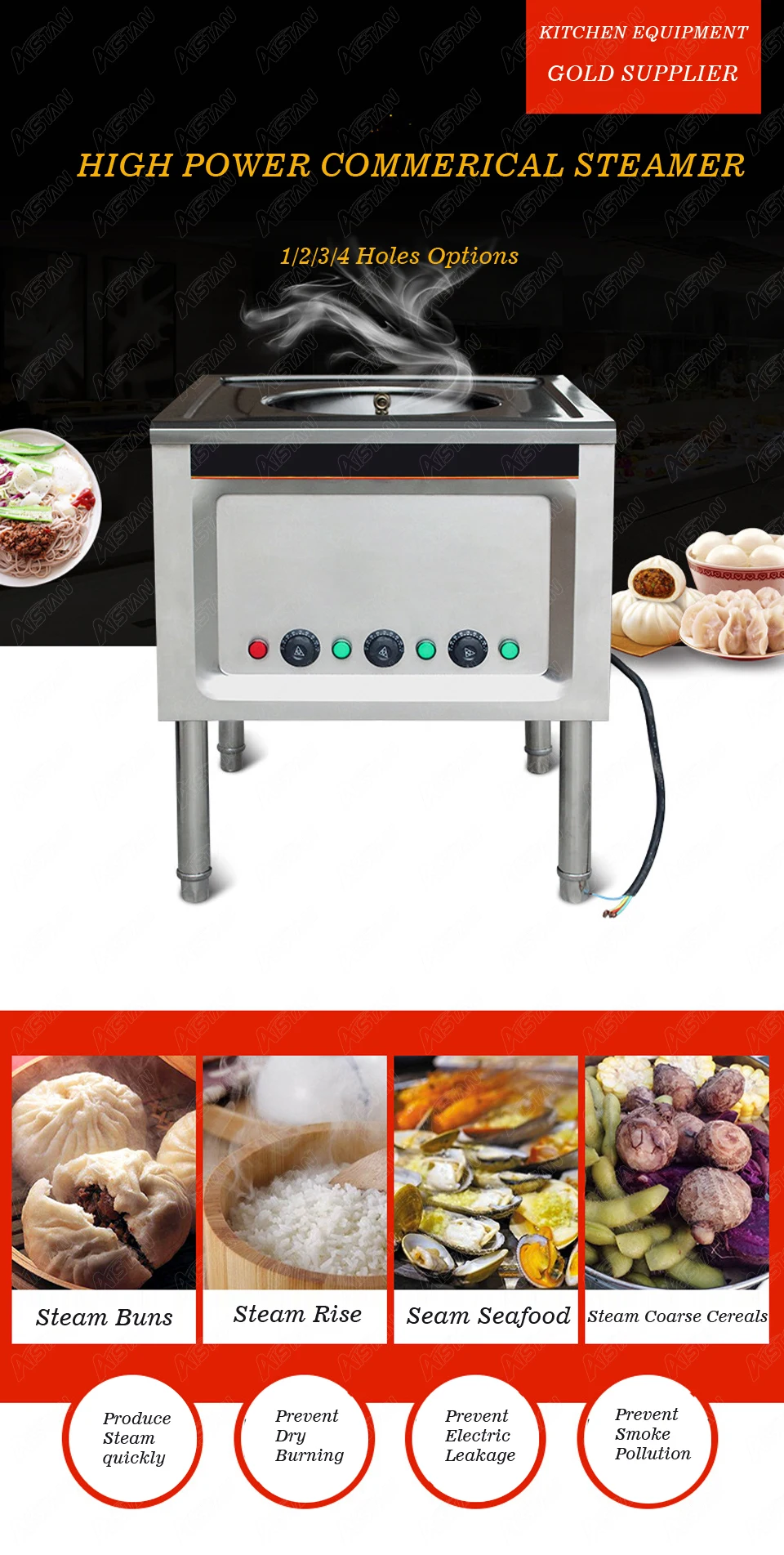 1. Один, два, три, четыре отверстия, мы предоставим четыре верхние пластины из нержавеющей стали с машиной. Вы можете заменить 4 различных вида парения. 2. Быстро произвести пар; Предотвратить сухое горение; 3. Полностью корпус из нержавеющей стали, легкая панель управления