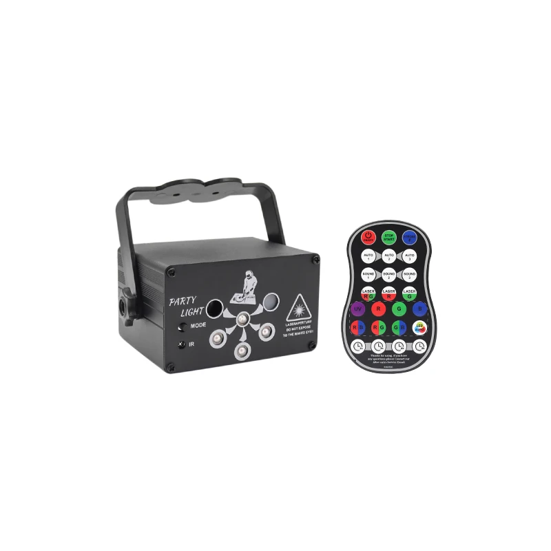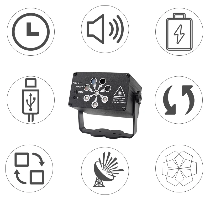 Особенности: 1. 128 различных великолепных узоров с динамичным красочным светильник создает незабываемые воспоминания. 2. С УФ-лампами, может отражать флуоресцентный эффект, сделать ваши вечерние более веселыми. 3. Идеальный дизайн, компактный и легкий, простой в использовании и перемещении. 4. Звук активный, автоматический режим и пульт дистанционного управления, красный и зеленый, автоматически воспроизводит или воспроизводит музыкальный ритм. 5. Встроенный вентилятор охлаждения, защищает светильник и увеличивает срок службы. 5. Регулируемый кронштейн для различных углов освещения для удобного размещения в любом месте. 6. Подходит для дискотек, танцевальных залов, КТВ, баров, сцены, отелей, вечеринок, ночных клубов, банкетов, игровых площадок и т. д. Технические характеристики: Светодиодный светильник: 3 в 1 RGB + УФ-лампа Источник лазера: 532 нм зеленая инфракрасная машина * 2, 650нм Красная инфракрасная машина * 2 Мощность Блок питания: USB Адаптер питания: DC5V/2A (не входит в комплект) Использование окружающей среды: 10 ~ 40 ℃ в помещении Режим управления: ручной, пульт дистанционного управления. Голосовое управление Режим работы: Голосовое управление, самоходный, вспышка Вес: около 340 г Упаковочный лист: Лампа * 1 1 x ИК-пульт дистанционного управления (без батареи CR2025 3V); Кронштейн * 1 Винт * 2 Кабель USB * 1 Руководство * 1