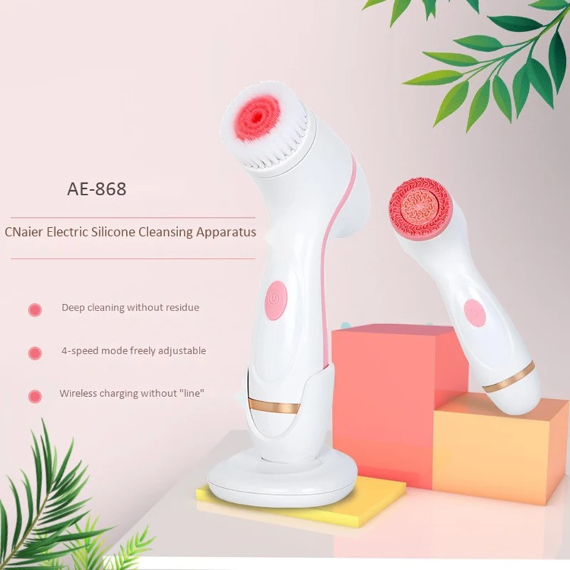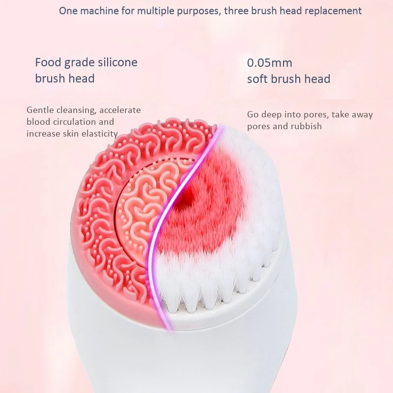 [3 в 1 дизайн] поставляется с 3 сменными чистящими головками, 2 чистящими щетками для кожи, силиконовая щетина для массажа лица и очистки, 1 мягкая и тонкая Щетинная головка Dupont тщательно очищает поры кожи.