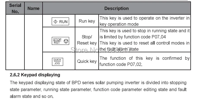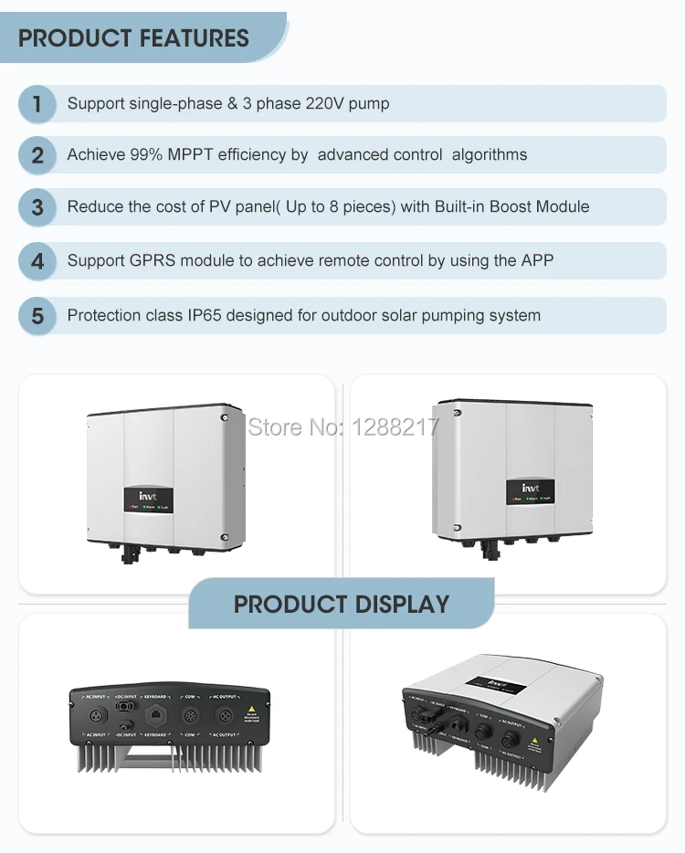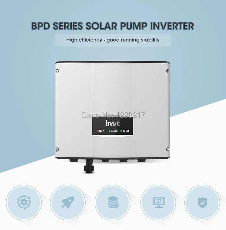 Инвертор солнечного насоса серии BPD Солнечный инвертор водяного насоса серии BPD использует динамическую технологию VI MPPT и технологию управления двигателем и подходит для водяных насосов переменного тока с быстрой реакцией, высокой эффективностью и стабильной производительностью. Особенности: 1. Поддержка прямого вождения однофазного двигателя (не Срывайте пусковой конденсатор), также поддерживает трехфазный двигатель 220 В. 2. Один насос инвертор может оснастить с mutiple моторов, поддержка векторного управления. 3. Класс защиты IP65 и конструкция безвентиляторной системы, применяются быстроразъемные клеммы, с удобной установкой и отвечают различным жестким внешним условиям. 4. Имеет функцию обхода, может поддерживать 220 В входную мощность и вход дизельного двигателя; Дополнительный модуль обнаружения уровня воды и модуль запуска/остановки дизельного двигателя. 5. Низкое Пусковое напряжение и широкий диапазон входного напряжения дают больше возможностей для принятия мульти PV струны конфигурации и различных типов PV модуля. 6. Цифровое умное управление может гибко регулировать и устанавливать диапазон скорости насоса. В дополнение к функции мягкого запуска также может обеспечить защиту от молнии, перенапряжения, перегрузки по току, функцию защиты от перегрузки и т. д. BPD может позволить насосам использовать новую солнечную энергию, больше не нужно тратить слишком много электроэнергии. Что касается применения водяного насоса, большинство насосов для домашнего хозяйства-это однофазный насос, обычно Входная мощность от сети переменного тока. С развитием фотоэлектрической промышленности, все больше и больше людей начинают использовать новую энергию, в последние годы эффективность работы PV панели становится все более и более высокой, благодаря разработке электронных устройств управления производительность драйверов и контроллеров является более надежной. Но до сих пор нет подходящего солнечного драйвера для однофазного насоса, за исключением инвертора серии INVT iMars BPD. В некоторых случаях людям нужен насос, работающий днем и ночью, чтобы повысить эффективность. При использовании общего солнечного инвертора люди должны добавить периферийные устройства управления, чтобы закончить цепь переключателя, сделать вход питания от PV к сети переменного тока. Это сделает всю систему более сложной. А что касается общего солнечного инвертора, ему необходимо высокое входное напряжение PV, чтобы подтвердить выходное напряжение драйвера, отвечающее номинальному напряжению водяного насоса. Солнечный Инвертор серии BPD обеспечит безопасное и полное решение. Успешных чехол