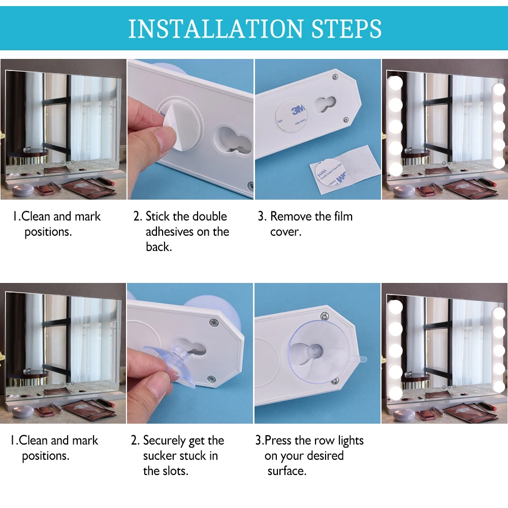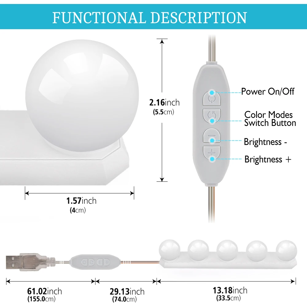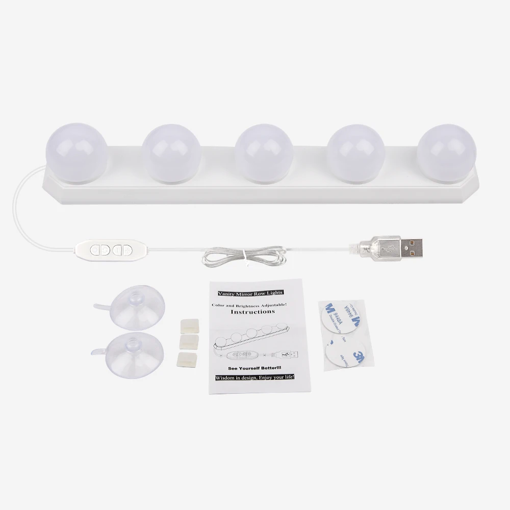 1. Регулируемый эффект освещения: полностью 5 затемнения светодиодный лампы с 3 цветовых режимов и 10 уровней яркости, простое переключение и регулировать нажатием кнопки 。 2. Простая установка: поставляется с полезным набором для установки, который включает в себя двухсторонние клейкие прокладки и сильные поглощающие присоски для установки дрели бесплатно. 3. Гибкие применения: широко применяется для заполнения естественного светильник для безупречного макияжа, съемки и селфи или дома DIY, также может быть помещен на стены, чтобы работать как ночной Светильник в темной среде, или Украсьте столешницы и столешницы, гардеробную и ванную комнату. Технические характеристики: 【Мощность продукта 】: 4 Вт 【Источник питания 】: usb-кабель 【Классификация temperature】: три цвета положительных белый светильник, теплый белый светильник и естественный белый (регулируемый) 【Length】: 33 см 【Количество ламп 】: 5 ламп 【Размер лампы 】: лампа G45 (диаметр лампы 45 мм) 【Особенности упаковки: 345*70*56 мм 【Вес одного комплекта: 245 г 【Материал】: ПК 【 Способ установки: присоска/пенная клеевая паста установка (один из них может быть выбран) 【Упаковочный лист 】: ленточный светильник + присоска + Поролоновый клей + диммер + руководство