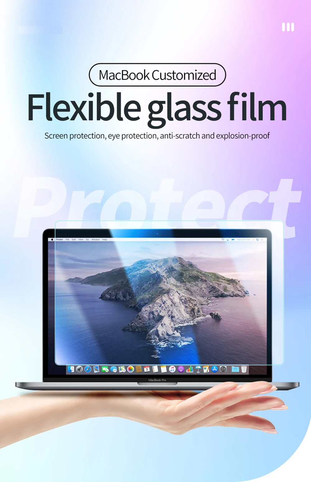 Почему вашему Macbook нужна Гибкая стеклянная пленка? 1) стеклянная пленка Apple bar (гибкая стеклянная пленка): может достичь эффекта более 2K. 2) новый ноутбук имеет разрешение 2K или более в ультра высокой четкости. Обычная закаленная пленка (жесткая пленка) будет иметь радужную рябь, которая влияет на визуальный эффект и гибкость бара. 3) Гибкая стеклянная пленка оптимизирована с высококачественной мягкой пленкой поверхностного слоя, покрытого стеклянным слоем, который может достичь зеркального эффекта