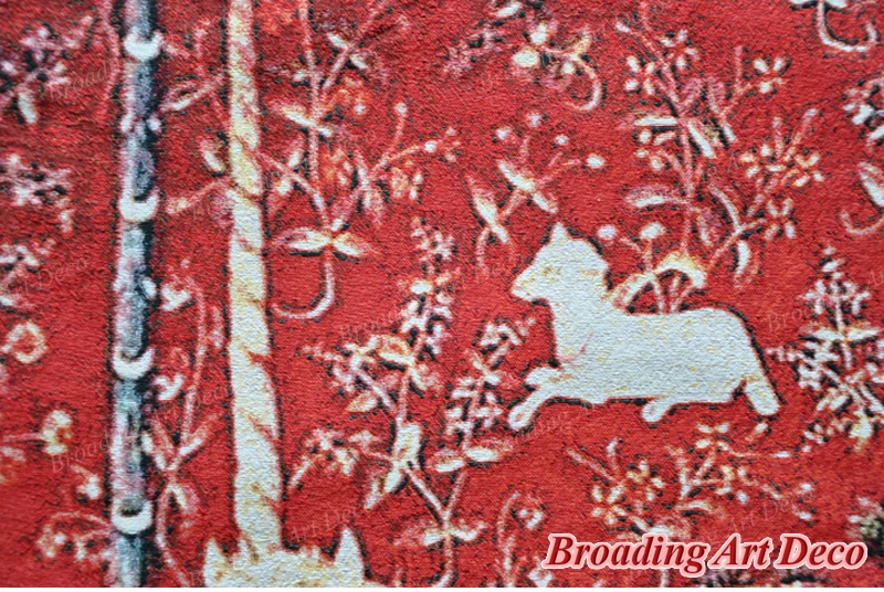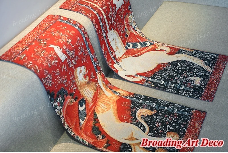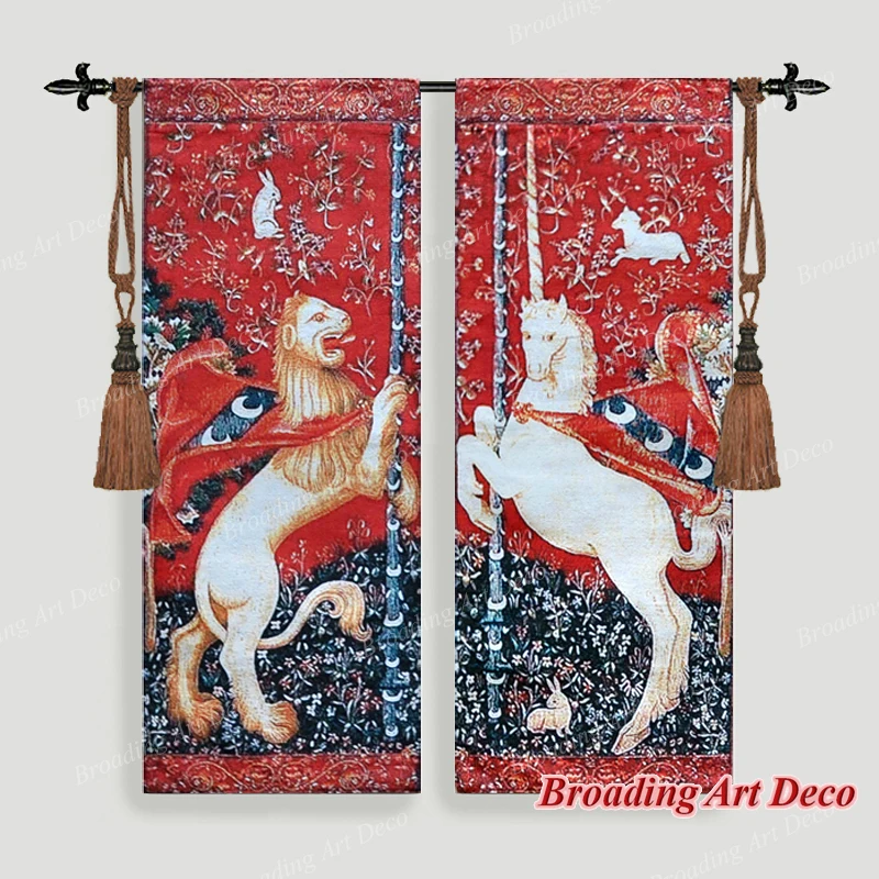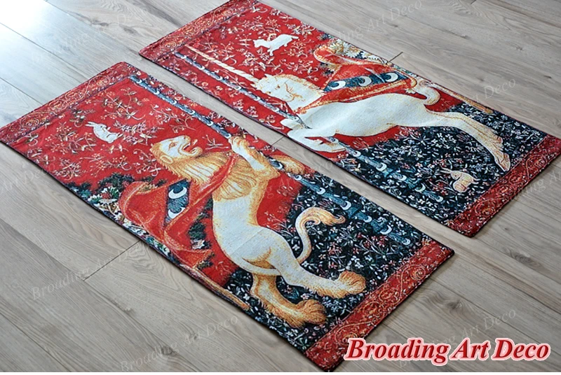 Гобелен Title: пара Единорог и лев Высота: 98 см (39 дюймов) Ширина: 76 см (30 дюймов) Вес: 0,5 кг (1,1 фунтов) Материал: полиэстер Место производства: соткано в Китае Стиль: жаккардовое переплетение Стирка: только химчистка Задняя сторона: Полностью на подкладке, с двумя карманами для удочек сверху и снизу