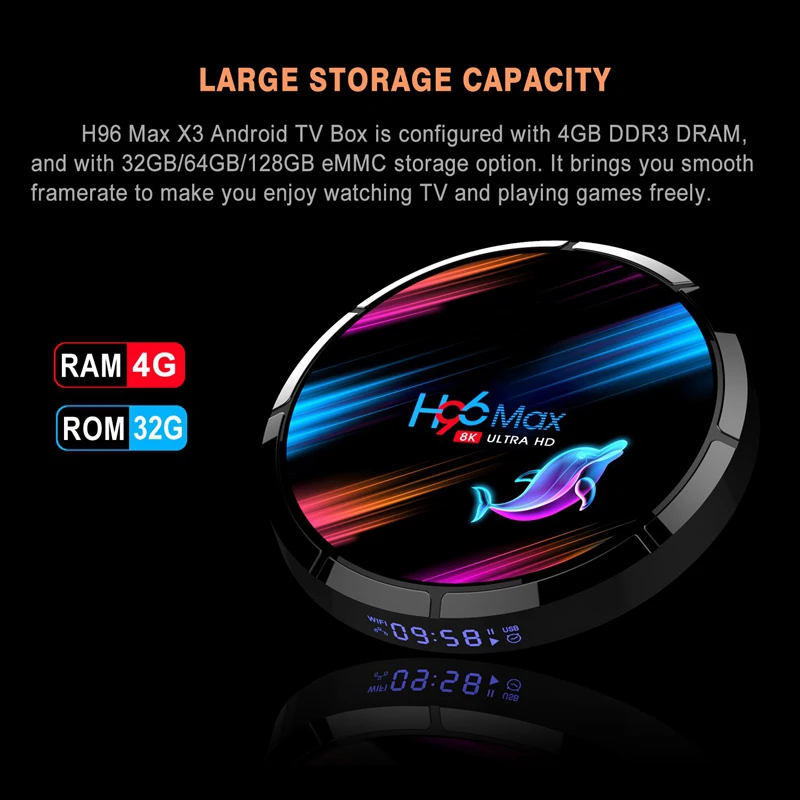 Видеовыход: HDMI 2,0; Ethernet: 1000 м; Беспроводная связь: Да; GOOGLE Cast: да; Вес: 0,4 кг; IPTV: да; OTA Update: Да; Мощность: 5 В постоянного тока, 2А; Номер модели: H96 MAX X3; Обновление системы: да; Макс. Увеличенная емкость: tf-карта до 32 Гб; Пульт дистанционного управления: в комплекте; HDR: HDR10 и HLG режимы; Поддержка декодера Формат: 4K VP9 видео декодер, H.265/H.264 видео; HDMI: HDMI 2.0a для 4k 60Hz; Система;