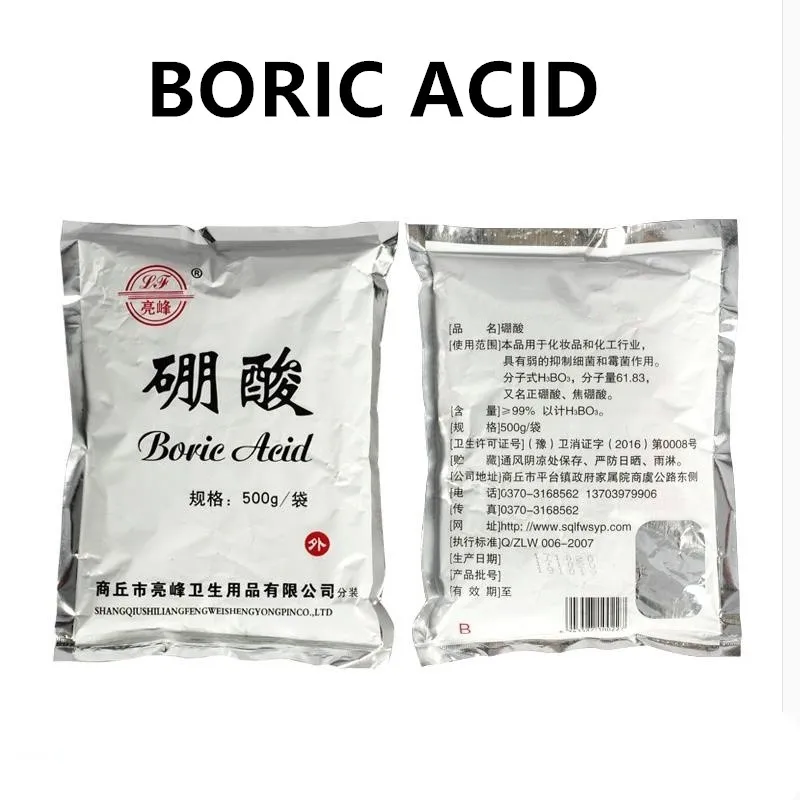 Борная кислота широко используется для стекольной промышленности, в частности, для E-glass fibers, но также не может быть закреплена бурой. В эмалированной, керамической промышленности продукты, используемые для повышения блеска и стойкости. Используется для хранения лекарств и древесины. Фунгициды могут быть сделаны в сельском хозяйстве, пестицидах и микроэлементных удобрениях. Борная кислота производится из диборидного матричного материала, а ее металлические сварочные материалы, кожа, драгоценные камни, электроника, оборонные и научно-исследовательские отделы широко применяются. 100 грамм упаковано в мешок из фольги