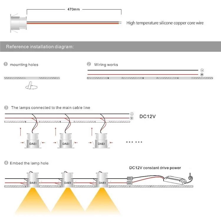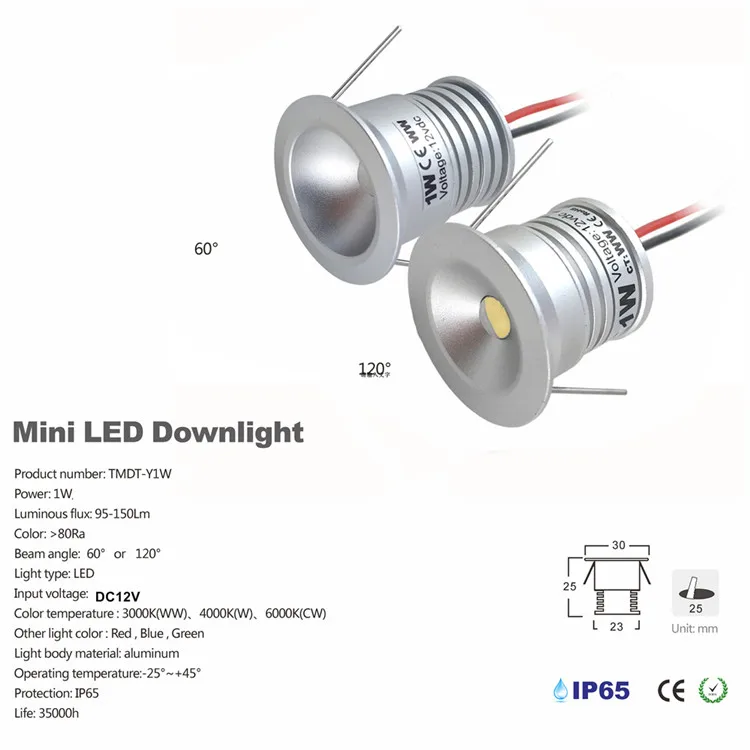 Мощность: 1 Вт Epistar светодиодный Люмен: 95 лм Входное напряжение: DC12V Светильник Угол луча: 60 ° 120 ° Водонепроницаемый для освещения: IP 65 (драйвер: IP67) Основной материал: алюминий Размер корпуса: d30 мм x25 мм Кабель: 47 см тефлоновый кабель Рабочая температура: -25 °C ~ + 45 °C Гарантия: 3 года с CE и ROHS, срок службы чипа 35 000 часов Цветовая температура: теплый белый (2700-3000K), натуральный белый (4000-4500K), холодный белый (6000-6500K) Использование: комнатный декоративный светильник, КТВ комнаты, лестницы указывающий светильник, шкаф витрина светильник, и другие Дизайнерское освещение «сделай сам»