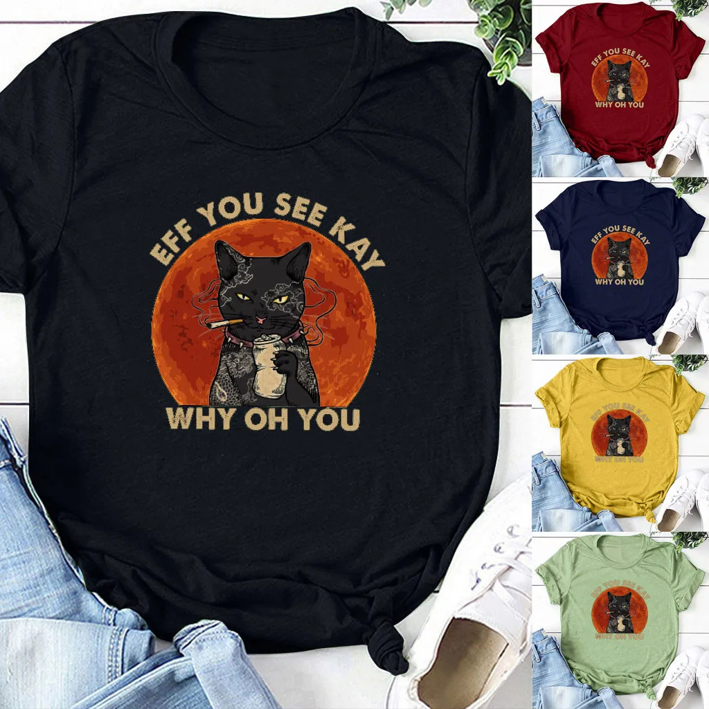Женская модная Повседневная Блузка с круглым вырезом и надписью «Black Cat»