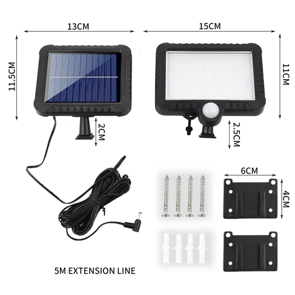 1. Материал: АБС-пластик 2. Лампа: 100 COB 3. Цвет: черный 4. Переключатель: без выключателя (штекер Яркий) 5. Солнечная панель: высококачественный поликремний, 5,5 В 1 Вт 6. Мощность Потребляемая мощность: 1,5 W 7. Функция: человеческое тело 8. Индукционный Люмен: 600лм 9. Светильник источник: 100COB 10. Индукционное расстояние: 5-8 м/16,41-26,25 футов 11. Рабочие часы: Зарядка 6 часов в течение дня и работа более 10 часов в ночное время 12. Способ установки: сверление отверстий, подвешивание стен 13. Батарея: Встроенный 18650 литиевая батарея Батарея 3,7 V 1200 мА-ч 14. Режим зарядки: автоматическая зарядка солнечной панели 15. Функция: Автоматическая Солнечная зарядка в течение дня.