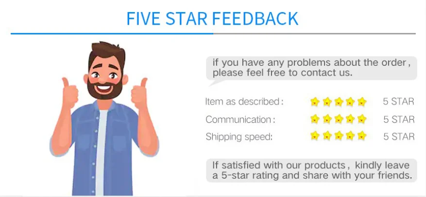 Для нас, если вы довольны нашим обслуживанием, пожалуйста, оставьте нам хороший 5 звезд и положительный отзывы, которые могут помочь нам обслуживать клиентов лучше и лучше. Если у вас есть проблема или вопрос о транзакции, пожалуйста, свяжитесь с нами, прежде чем оставить какие-либо отзывы или открыть любой спор, негативные отзывы ничего не решают, мы сделаем все возможное, чтобы решить проблемы.