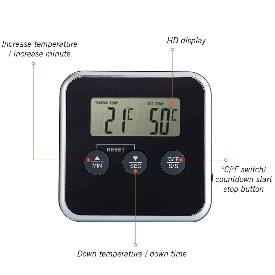5. Вставьте зонд в пищу. Когда температура достигнет заданной температуры, термометр подаст сигнал тревоги