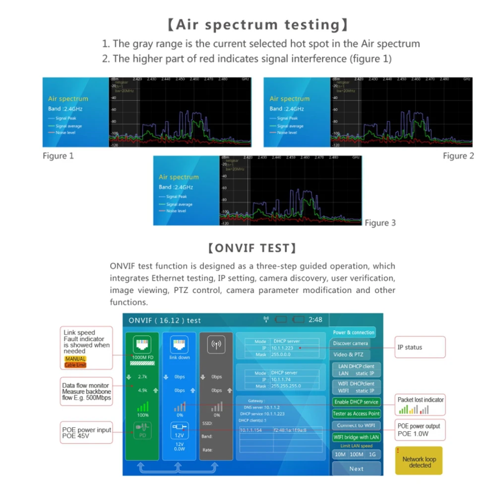 【 Дизайн «5 в 1»-TI-N82 является универсальным тестером «5 в 1». Поддержка тестирования сети, IPC тест, TDR тест точки останова сети, PTZ контрольный тест, аналоговый, коаксиальный HD тест, мониторинг сигнала HDMI, беспроводной тест. Применяются к монтажу оборудования, вводу в эксплуатацию оборудования, поиску и обслуживанию для обеспечения безопасности. 【Мощный анализ данных capabilities】 -- TI-N82 фиксирует данные периода времени и скриншоты формы волны событий, чтобы помочь определить коренную причину проблем устройства и линии. Помощь в разрешении самых сложных прерывистых событий, легко для техников для просмотра и анализа. 【WIFI test】-Встроенная функция беспроводной Wi-Fi, может проверить беспроводную сетевую камеру, поддержка создания точки доступа Wi-Fi, Wi-Fi и подключения к локальной сети. Поддержка 2,4G, диапазон частот 5G, тест спектра, тест на прочность сигнала. Поддержка HD-CVI 8MP/ TVI 8MP/ AHD 5MP тест изображения с высоким разрешением, коаксиальное управление видео и вызов меню OSD, поддержка фото, видео, зум, воспроизведение, простое инженерное решение. 【More More features】-одновременная поддержка аналоговых SD, аналоговых HD, сетей HD систем мониторинга. Протокол ONVIF очень совместим (поддерживает H.264/ H.265/ 4K). Двойной сетевой интерфейс 1000 м и может обнаруживать потерю пакетов, поток данных и т. Д. Внешняя Складная двойная антенна, Двухчастотная двунаправленная антенна.