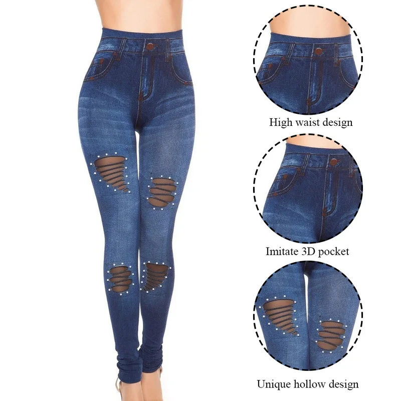 Модные женские обтягивающие леггинсы размера плюс, с жемчужинами, рваные бесшовные, высокая талия, искусственные лосины из джинсовой ткани, повседневные женские узкие брюки