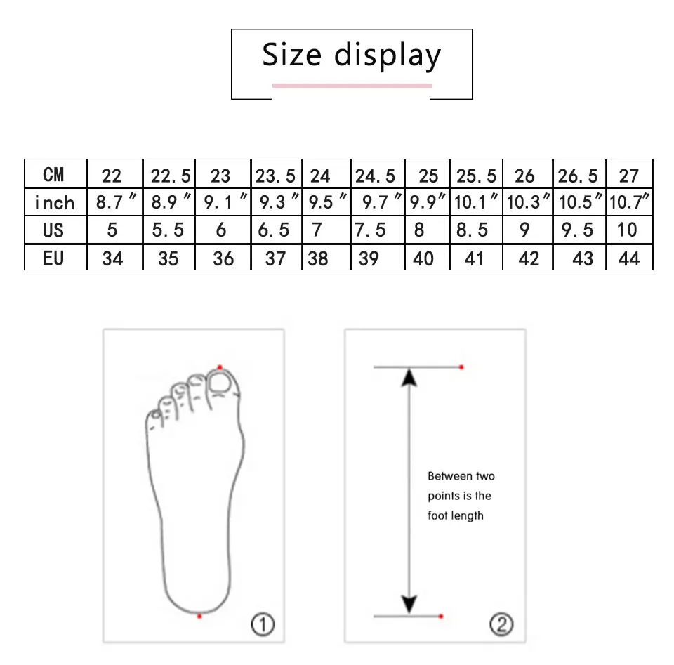 Размер: Пожалуйста, выберите размер в соответствии с длиной Вашей стопы. Если у вас полная и широкая стопа, пожалуйста, выберите больший размер. Если вы не можете убедиться в размере, пожалуйста, свяжитесь с нами. Внимание: 1. Ширина обуви нормальная, возможно, обувь не подходит для слишком тонкой или слишком толстой стопы. 2. Средняя погрешность в таблице размеров составляет около 0,01 см-0,2 см. 3. Пожалуйста, измерьте длину стопы, как показано на рисунке: