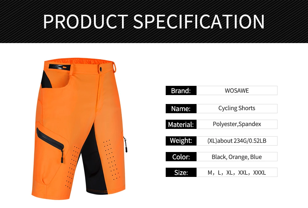 Описание: Дышащие и удобные велосипедные шорты WOSAWE для горного велосипеда Подходит для бега, мотоцикла, велосипеда, кемпинга, альпинизма и многих видов спорта на открытом воздухе Продукт Особенности: Высокое качество швов Светоотражающий логотип Анти-всплеск ткань Застежек-молний по обе стороны Регулируемая посадка на талии; Дизайн Удобные и дышащие Дышащие отверстия спереди и сзади Посылка включает в себя: велосипедные шорты-1 шт. Параметры: Название: велосипедные шорты Цвет: черный, оранжевый, синий Материал: полиэстер Размер: M, L, XL, 2XL, 3XL Вес: (XL) около 234 г/0.52LB Пол: человек Применение: мотоциклы, велосипеды, бег, туризм, альпинизм и другие виды спорта на открытом воздухе