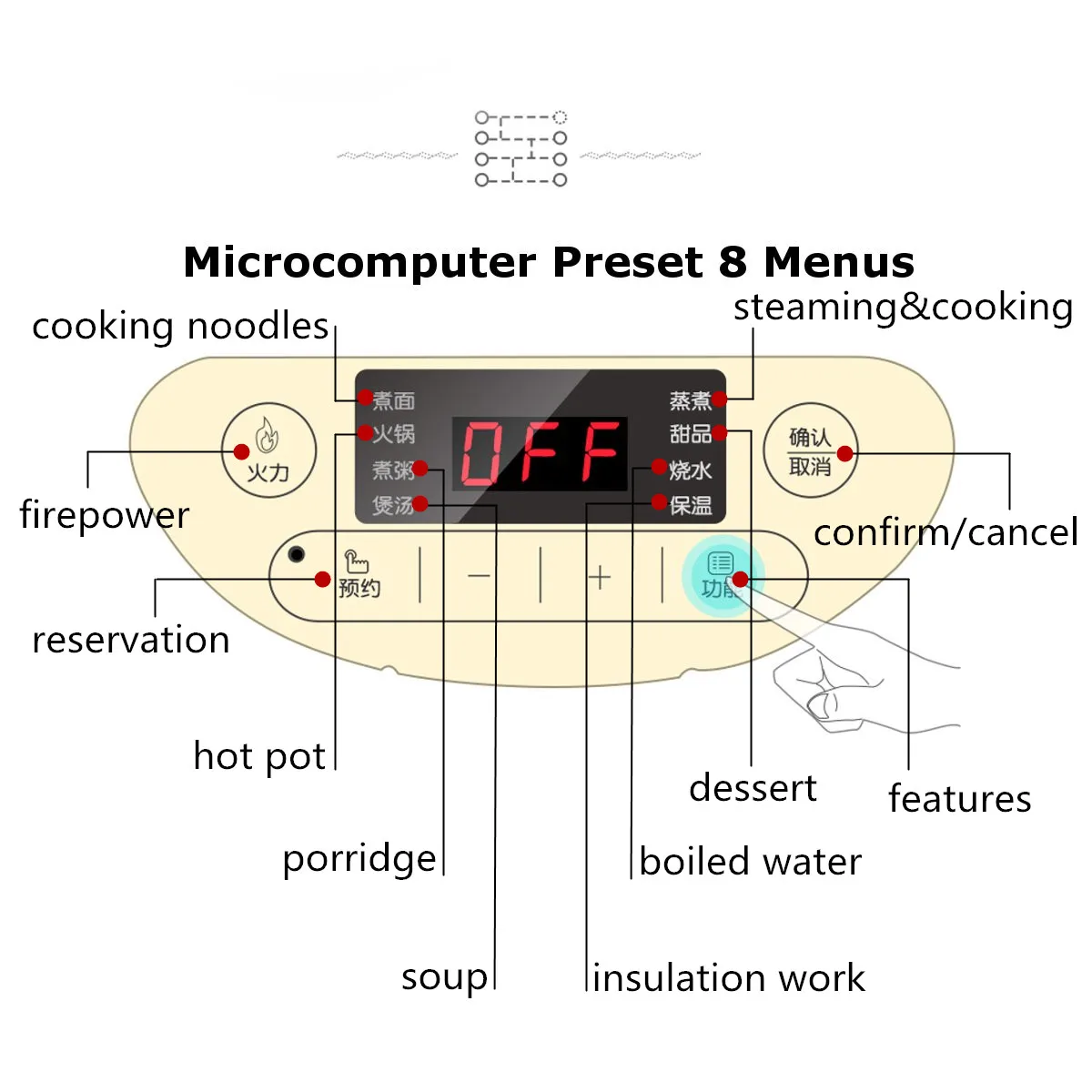 5. Микрокомпьютерное управление, с функцией назначения 9,5 часов для предотвращения высокой температуры или сухого горения, Автоматическое отключение питания, анти-аварии.