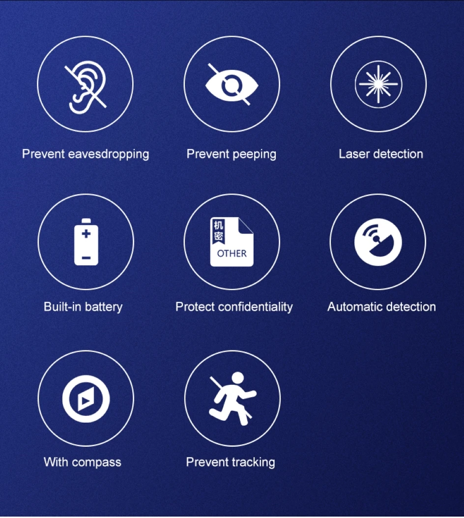Этот анти-детектор камеры с использованием современных чипов военного качества имеет мощную лазерную технологию, беспроводной сигнал и технологию обработки сигнала магнитного поля. С функцией автоматического обнаружения, вы можете завершить широкий спектр обнаружения в течение нескольких минут, устраняя все подозрительные риски, это может эффективно предотвратить подслушивание, видеозапись, мошеннические и защитить личные данные конфиденциальности и конфиденциальность информации