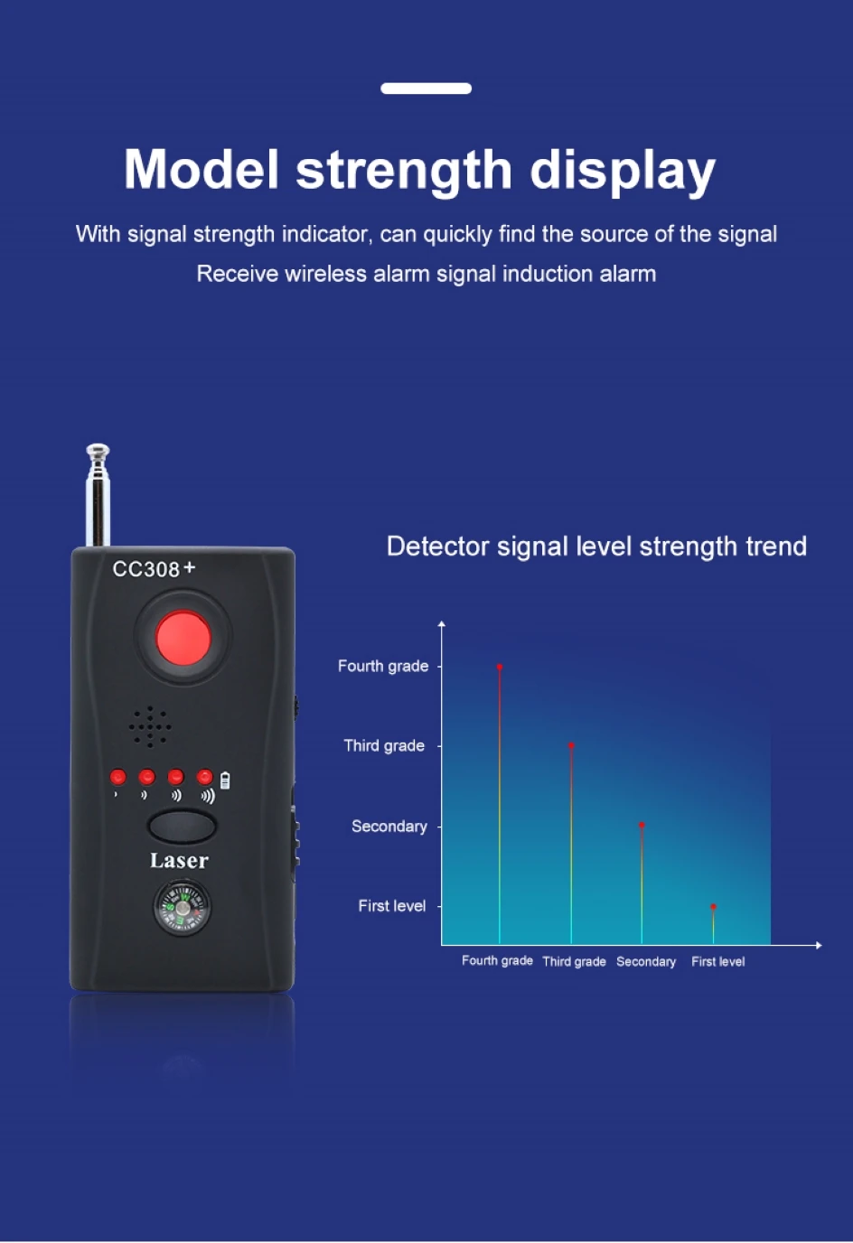 С помощью усовершенствованных чипов улучшенная модель проста в эксплуатации и портативна. Более сильный анти-помех и более широкий диапазон частот обнаружения. Этот продукт имеет режимы лазерного сканирования, Радиочастотное беспроводное Обнаружение сигнала, обнаружение магнитного поля сигнала и так далее. С высокой чувствительностью и сильной защитой от помех, он может точно обнаруживать различные электронные машинки, GPS локаторы, трекеры, беспроводная камера 1,2G ~ 6,5G, 2G/3G/4G сигнал от sim-карты ошибки и другого оборудования
