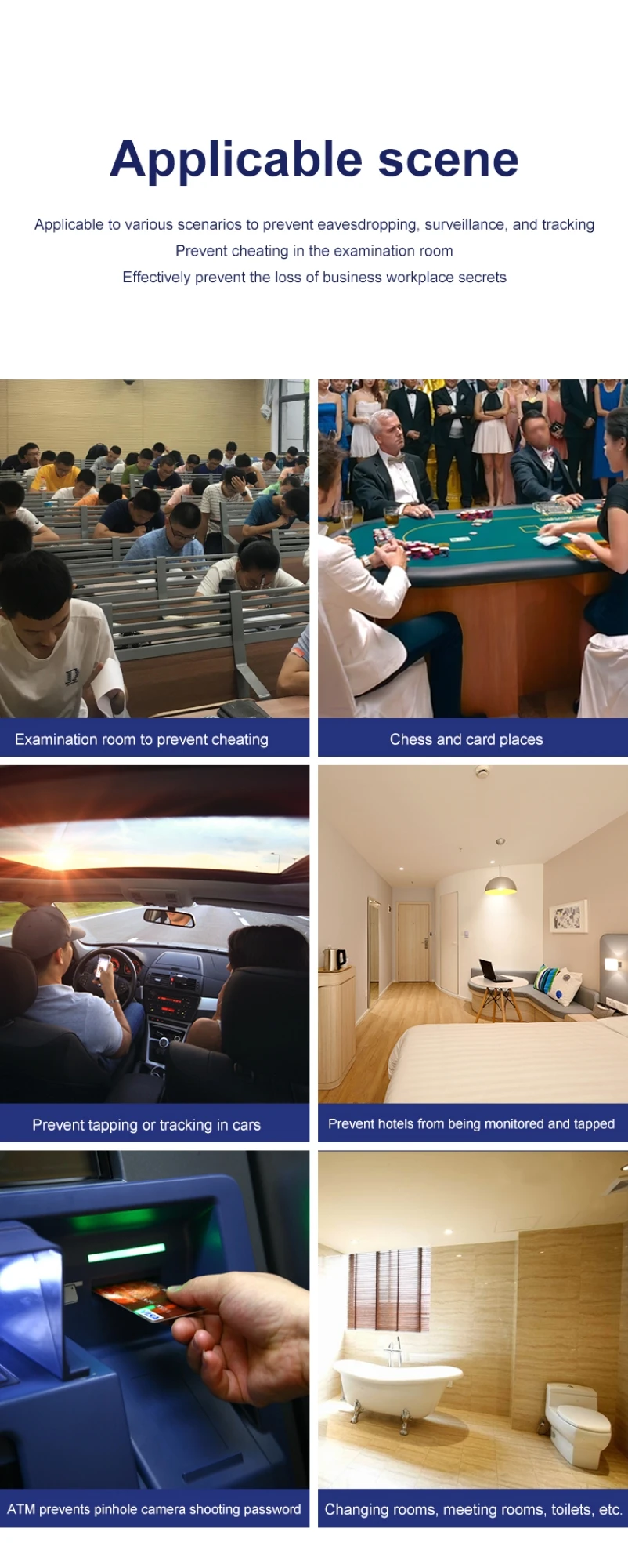 Частота RF от 1 МГц до 6,5 ГГц для всех FR частоты включают в себя GSM, WI-FI BT, FM, УКВ, УВЧ, 900 / 1200 / 2400 беспроводной аудио и видео передачи частот. Для дома, офиса, отеля, автомобиля, ванной комнаты, раздевалки, деловых переговоров, конфиденциальных встреч, заводов, важных мастерских и научно-исследовательских залов, Военная установка, государственные учреждения, развлекательные центры или в качестве монитора для школьных осмотров для предотвращения подслушивания, фотографирования, съемки видео или радиационной плотины