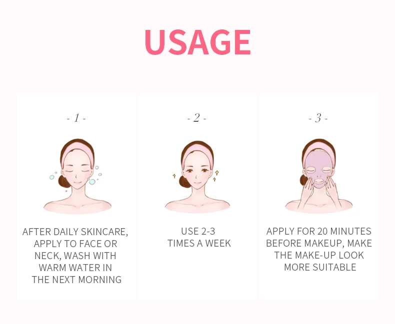 1. After daily skincare, apply to face or neck, wash with warm water in the next morning.