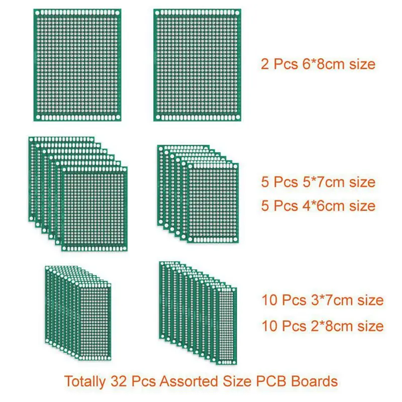 5 различных размеров двухсторонняя макетная доска включена в этот Ассорти прототипов плат. Вы также можете разрезать эти ПК доски в любой форме любого размера при проектировании собственных наборов Arduino, электронных экспериментов и DIY проектов