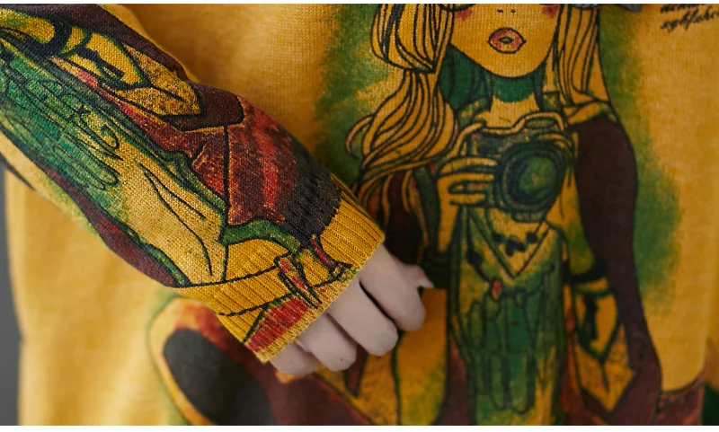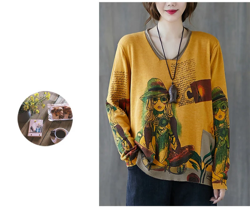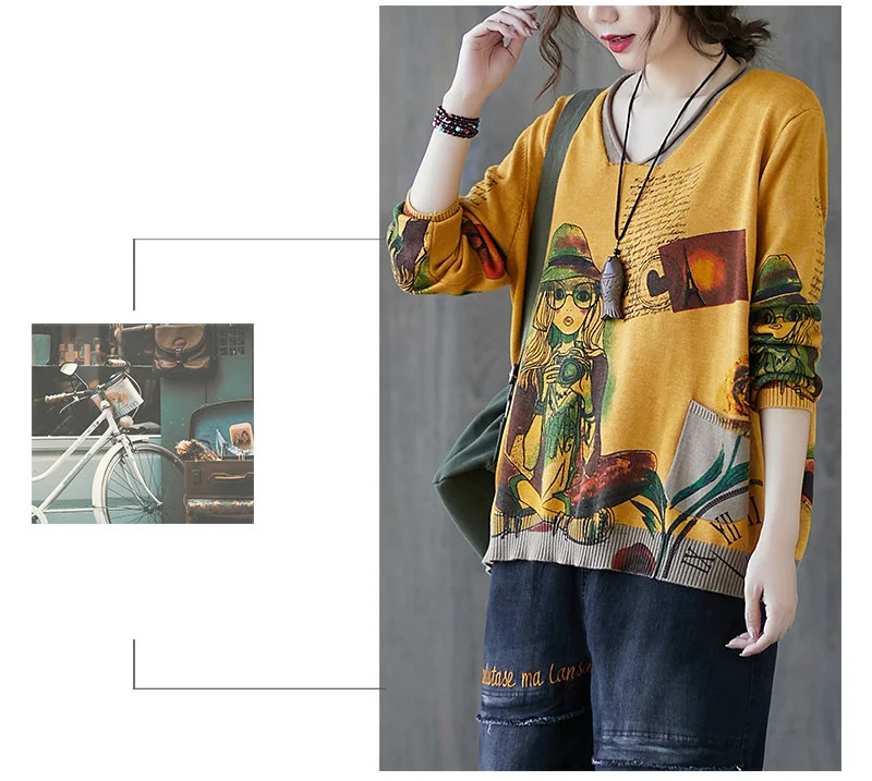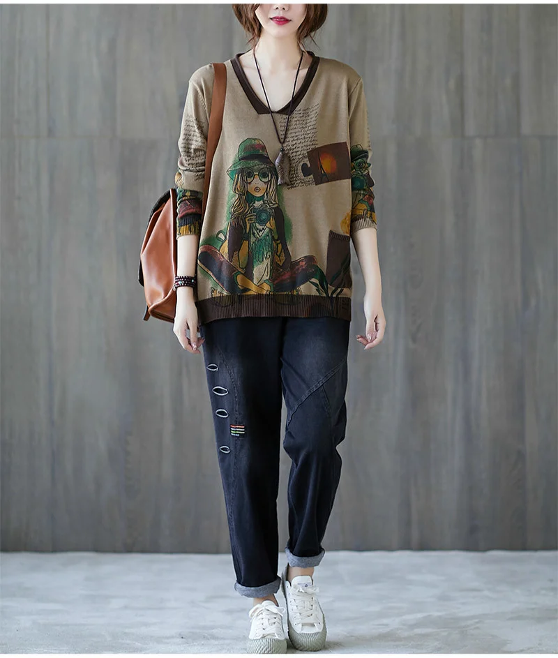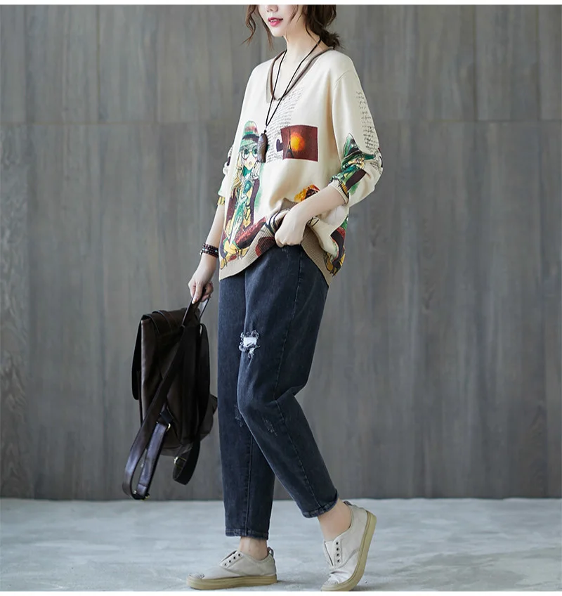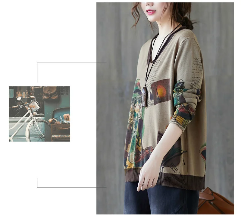 Европейский осенний Повседневный винтажный вязаный Свободный пуловер с принтом