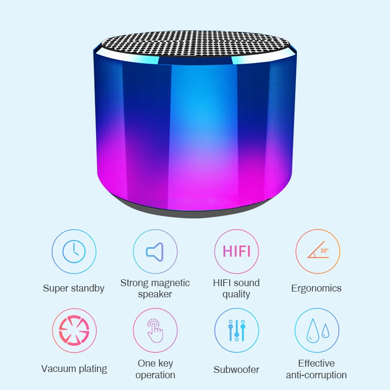 -Металлический корпус, деликатный захват. -Для аудио мы тщательно отбираем материалы и хорошо обрабатываем, позволяя вам плавать в океане музыки. -Аккумулятор большой емкости-длительное время работы в режиме ожидания. Пусть чудесная музыка будет непрерывной. -Быстрое соединение Bluetooth, оснащенное 4,2 микросхемой второго скоростного соединения, очень гладкое. -Динамик подходит для различных сцен, таких как: Бизнес Релаксация, Домашние развлечения, путешествия на открытом воздухе, семейный ужин, фитнес и отдых. -Наслаждайтесь замечательной музыкой, чтобы вы чувствовали себя по-другому. -Оснащен сильными магнитными динамиками, подарит вам динамические тяжелые басы, четкий срок службы, четкие высокие частоты, отличная интерпретация высокого качества, проникающий звук. -Bluetooth-динамик совместим с различными смарт-устройствами, такими как мобильные телефоны, планшеты, ноутбуки и т. д. -Не только цвета классные, но и производительность более мощная. Чувство музыки ударит вас.