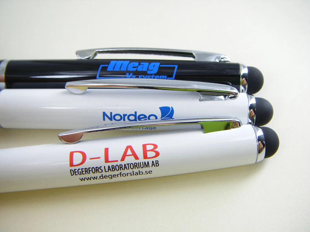 Очень хороший логотип гравировки на этом металлическом стилус шариковой ручки.
